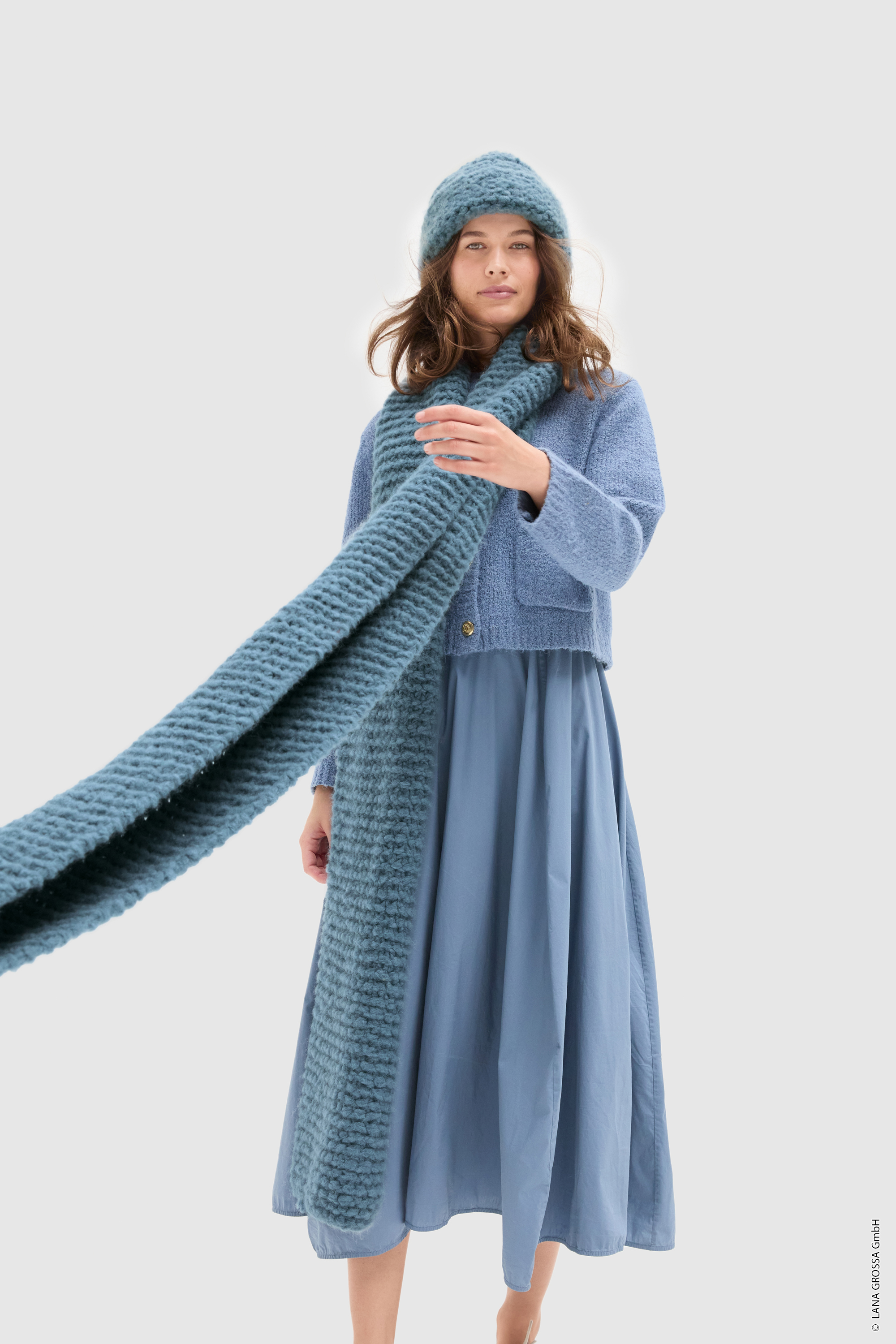 Neu sind wuchtige CHUNKY-MODELLE und interessante Schal Alternativen, die sich, wie Mini-Ponchos oder -Capes, an Hals und Schultern schmiegen. Außerdem angesagt: MATCHING-SETS, zum Beispiel als Combo aus Schal und Beanie oder Dreieckstuch plus Tasche. Dazu präsentieren wir fünf neue Qualitäten: die flauschigen Vertreter NEBBIA und MOHAIR DI GIO, die Bouclé-Version ORSETTO und die Paillettengarne, COSMO und GLAMOUR.